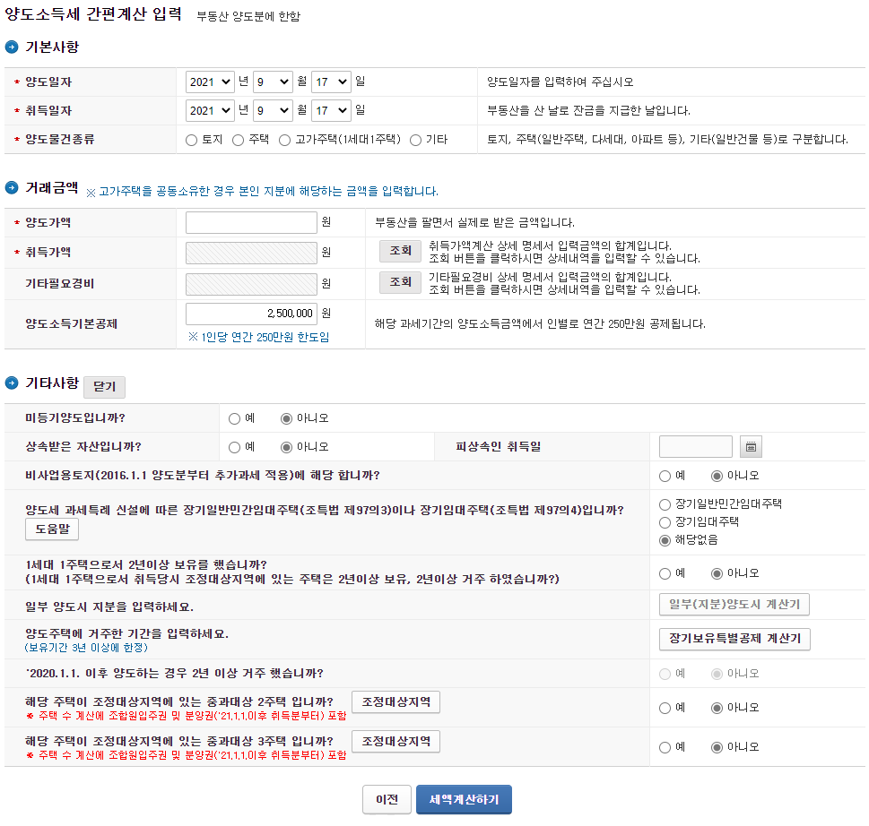 양도세를 계산하려면 기본사항, 거래금액, 기타사항을 입력하여야 합니다. 입력하신 후 맨 아래쪽에 있는 세액계산하기 버튼을 클릭하면 양도세액을 확인하실 수 있습니다.