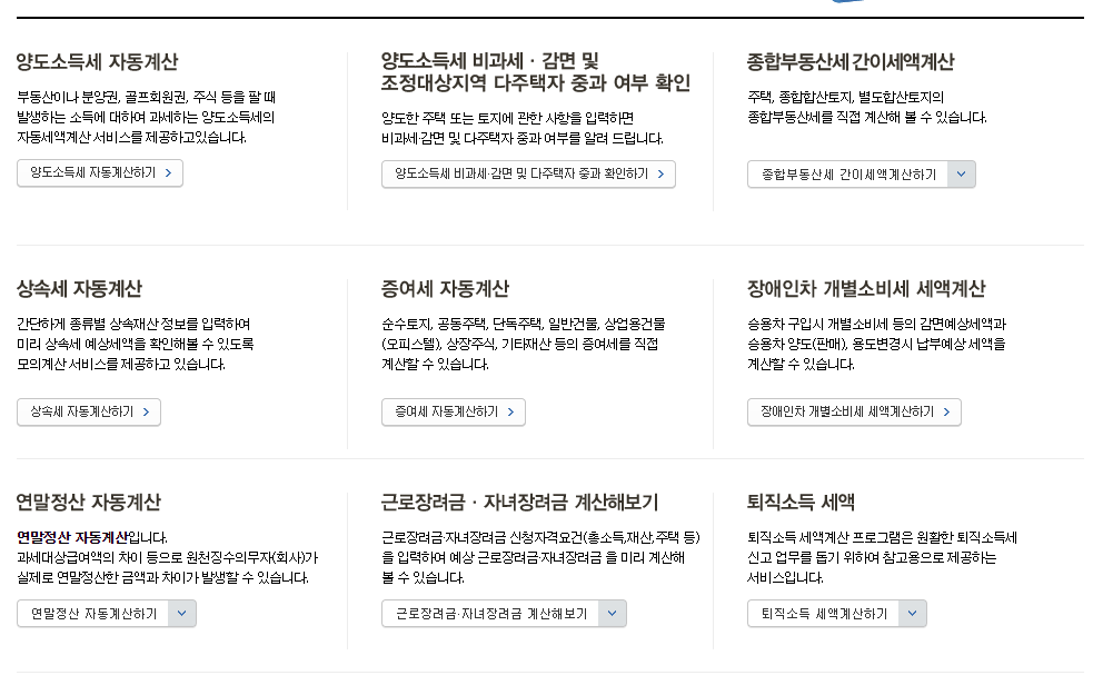 세금 모의계산을 클릭하시고 나면 세무 처리 등에 도움을 주기 위한 여러가지 모의 계산 서비스들이 나오게 됩니다.