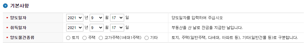 기본사항에서는 양도일자, 취득일자, 양도물건 종류를 선택하시면 되고 취득일자는 부동산을 산 날로 잔금을 지급한 날을 말합니다.