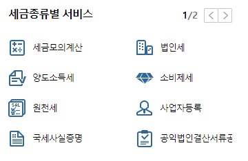 하단 오른쪽편에 세금 종류별 서비스가 있는데 종류별 서비스를 자세히 보시면 세금 모의계산 메뉴가 보일 것입니다.