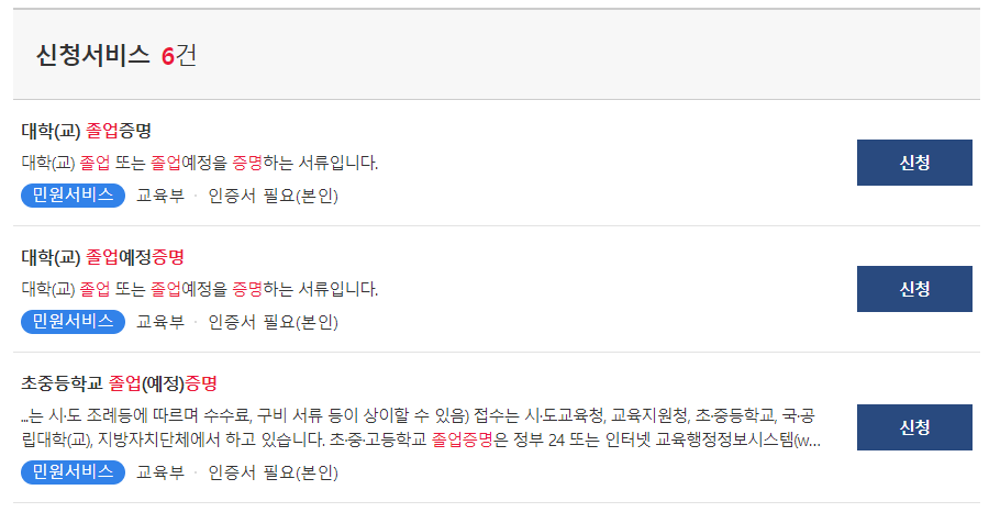대학교 졸업증명서를 발급받으시려면 맨 위쪽에 있는 것을 신청하면 되고 중, 고등학교 졸업증명서를 발급받으려면 세번째에 있는것을 신청하시면 됩니다.
