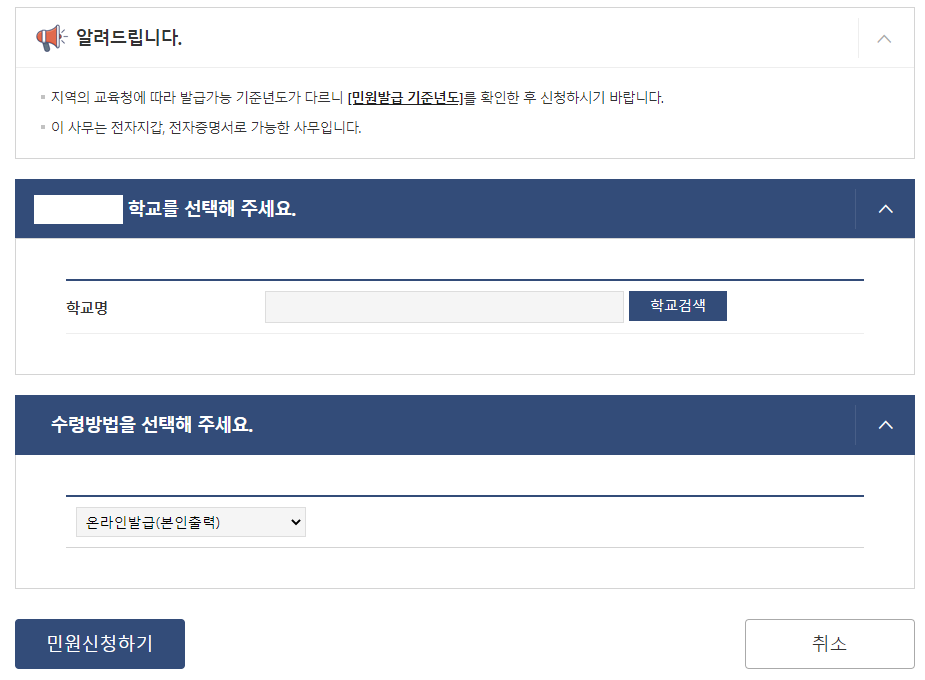 학교를 선택하신 후 민원신청하기를 클릭하시면 초, 중, 고등학교 졸업증명서 인터넷발급은 완료됩니다.