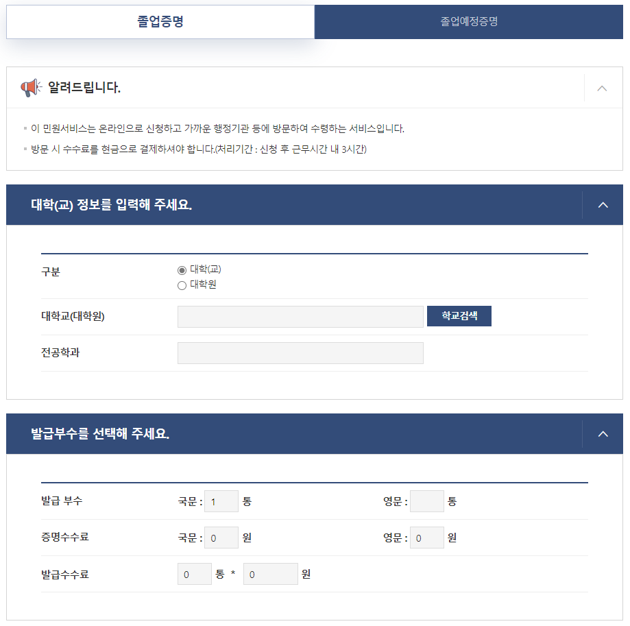 참고로 말씀드리면 대학교 졸업증명서는 인터넷으로 발급 신청만 가능하며 수령은 수령기관에 방문해서 할 수 있습니다.
