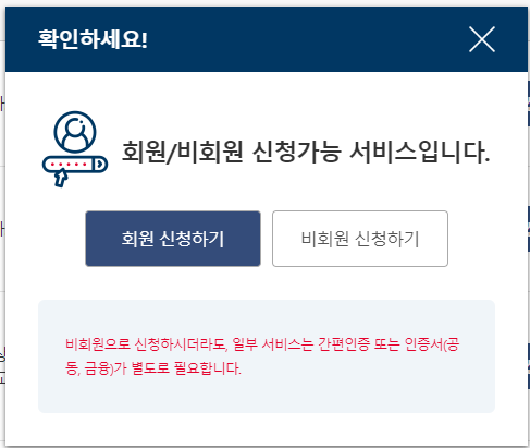 두 가지중에서 아무거나 클릭하셔서 신청을 하시면 되고 회원이라면 회원신청하기를 클릭하시는게 조금더 간편하게 발급받으실 수 있습니다.