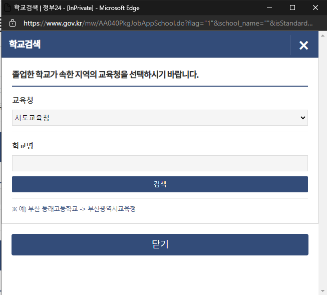 학교명을 선택하실때는 먼저 졸업한 학교가 속한 지역의 교육청을 선택하여야 하며 선택하신 후 학교명을 검색하면 해당하는 학교가 나오게 됩니다.